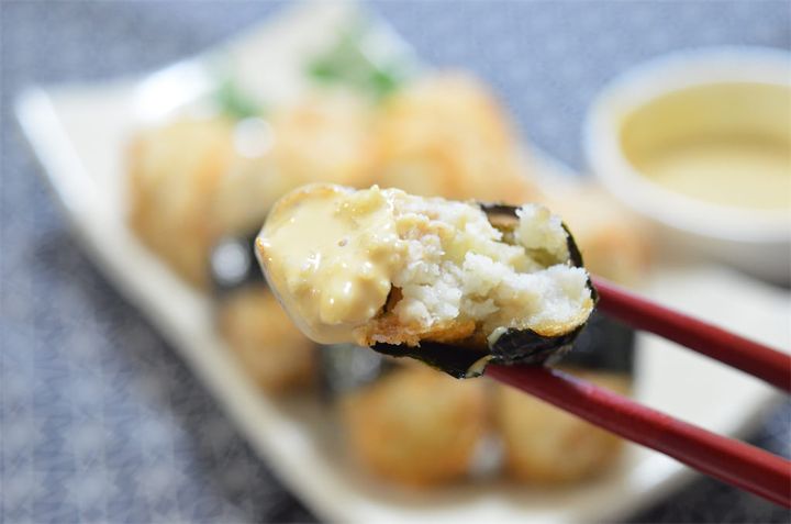 8.しょうゆとマヨネーズを混ぜ合わせてソースを作り、のりを巻いて完成。