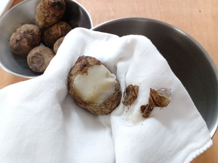 冷めない内に皮を剥きましょう。熱いので、さらし布などを使って剥いてくださいね。