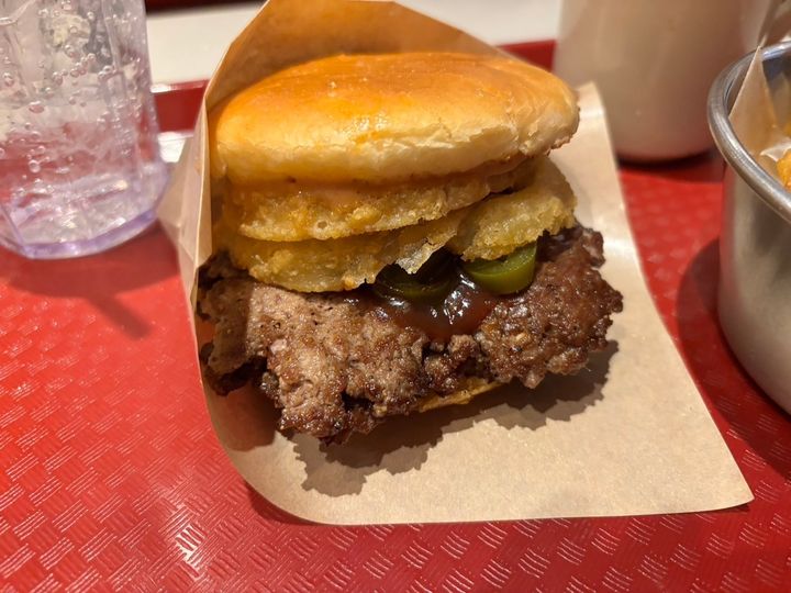ジューシーなパティとオニオンリングが挟まっている食べ応え抜群のバーガーです。