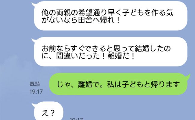 「でもお前ときたら俺の両親の希望を聞いても、子どものこと急ごうともしないし」「もういっそのこと離婚するか!」