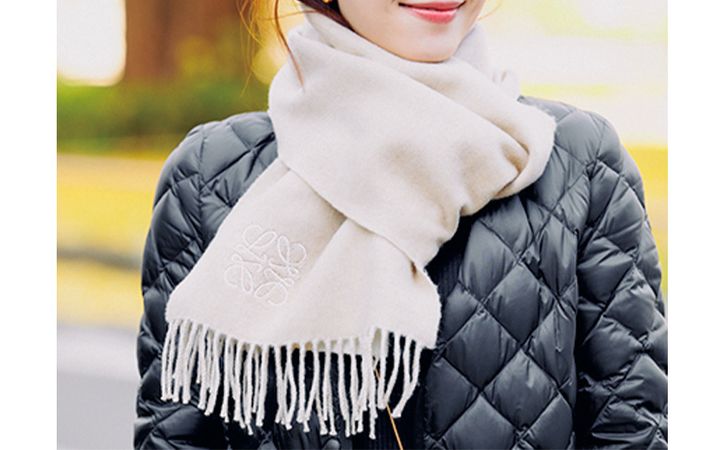 バタつく朝は一点で華やかに見えるブランド小物が絶対的頼りに。ロエベのマフラーは優しげなベージュで着回し力大。セルジオ ロッシのSR1は、1秒で履いて出掛けられる最強の助っ人アイテムです。