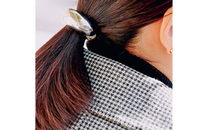 極薄メイクでも洒落感のあるべっ甲メガネでカモフラすれば、アクセで盛らずとも好印象に。POTETEのヘアゴムは寝起きの髪をサッとまとめるだけで手間をかけた感が出せるオシャレ名品!