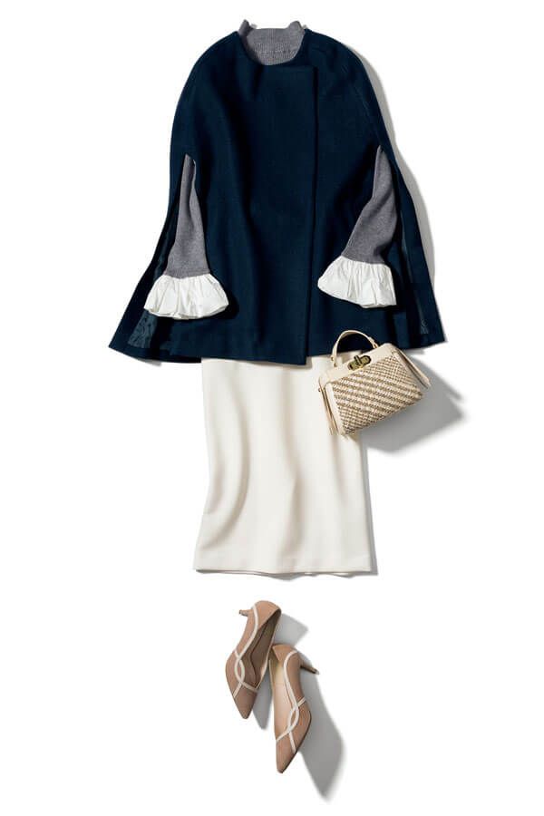 仕草まで美しくさせるケープコートを品格カラーで用意。インコーデはグレーとホワイトのモノトーンで洗練感よくまとめて。