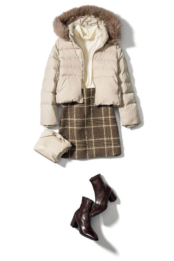 ブラウンチェックのミニ丈を基点に、淡色トーンで優しげ配色にまとめて。