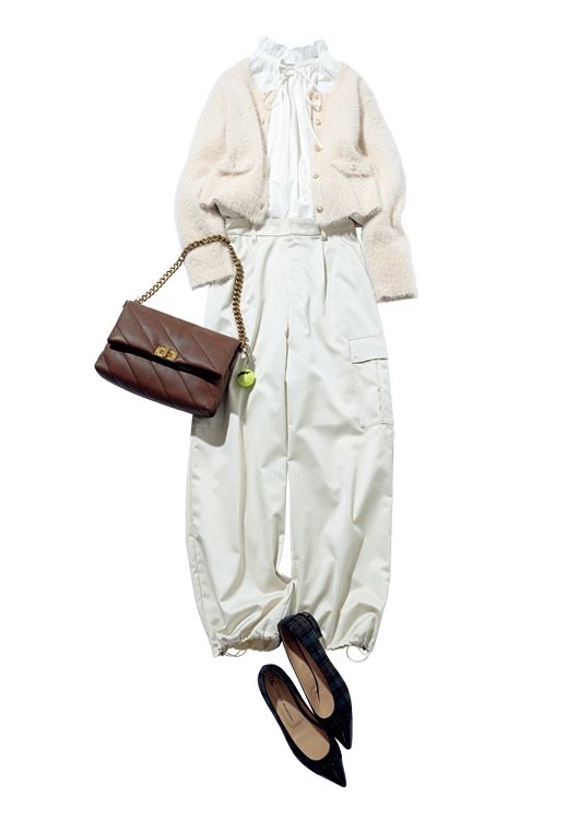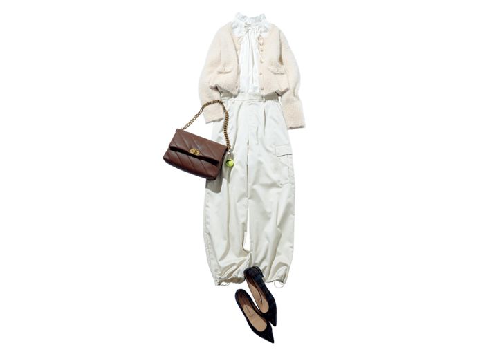 ギャザーブラウス¥8,990/アンフィーロ(オンワード樫山) カーゴパンツ¥22,000/Stola. シャギーアンサンブル(カーデ)¥11,990/NATURAL BEAUTY BASIC キルティングバッグ¥17,050/ダイアナ(ダイアナ 銀座本店) パンプス¥33,000/ファビオ ルスコーニ(伊勢丹新宿本店本館2階 婦人靴)