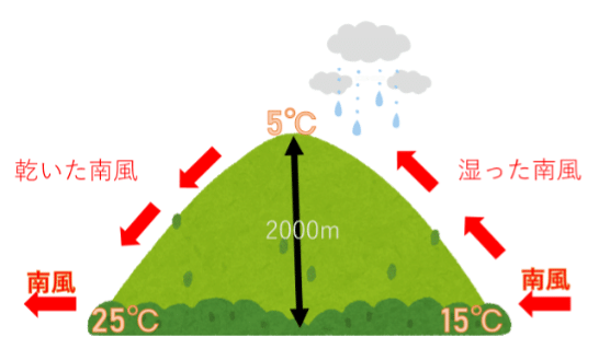 一方、フェーン現象は、太平洋で発生した水分を多く含んだ空気が、日本海側に向けて進む途中で日本列島の山地にぶつかって太平洋側で雨を降らせ、高温で乾燥した空気が山を越えて吹き下ろすことで起こります。