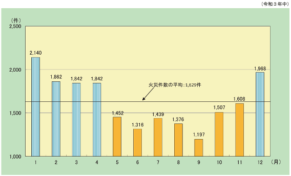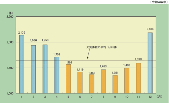 グラフから分かるように、1年を通して冬から春(特に12月から4月)にかけての火災件数が多くなっています。