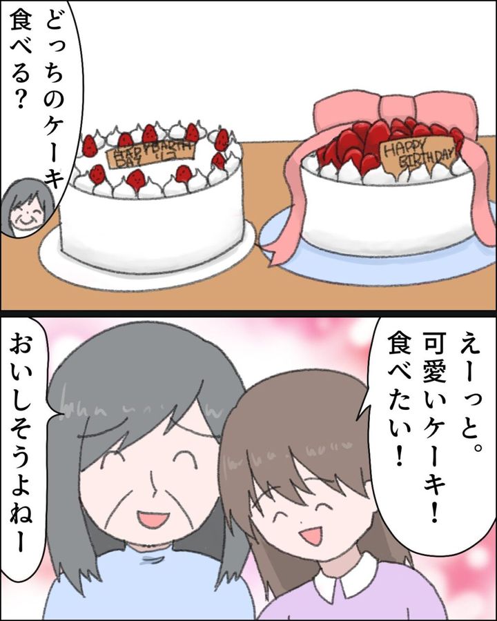 すると、「えーっと。可愛いケーキ!食べたい!」と嬉しそうに言うリコちゃんに、「おいしそうよねー」と義母も笑顔で言いました。