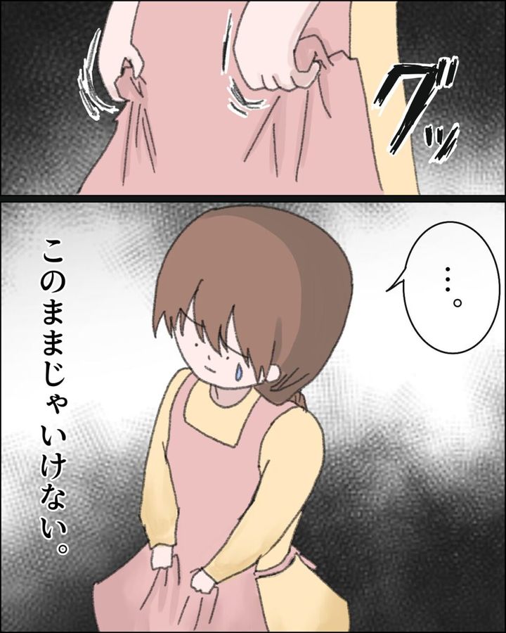 リコちゃんと義母のやりとりを聞いていたミサキさんは、エプロンをグッと掴んで考え込みました。そして、