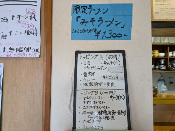 スタッフの方が、「麺量」(大300g、中200g、小150か100g)、「豚(チャーシュー)の枚数」(1~3枚)「ラーメンか、汁無し」が選べること、着席して作る準備ができた時点で「ニンニク」、「ヤサイ」、「アブラ」の量を聞かれるので、その時に伝えることを教えてくださりました。「その他にも分からないことは、質問したら丁寧にお答えします。」とのことで、ほっと一安心です。今回は、「小ラーメンで麺量は150g、豚2枚」(1300円)を試食させていただきました。因みに麺量は、茹で前の状態です。 セルフサービスのお冷を持って、着席です。 トッピングや限定メニューもありますし、豚丼も人気だそうですよ。