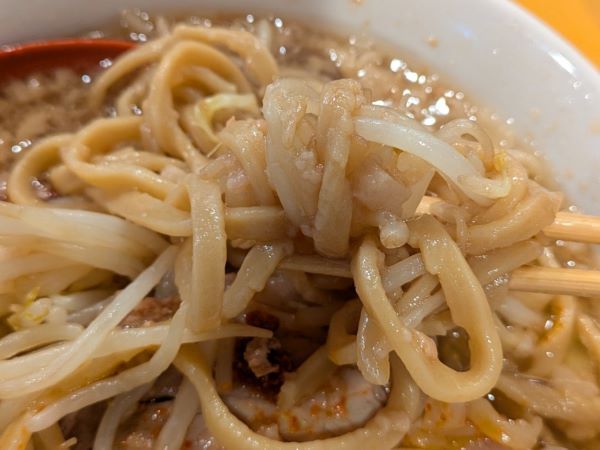 麺は、個人的に大好きな極太麺!よく見ると麺の表面がギザギザなのが分かりますか?この凹凸にスープが絡み、この倍は食べたかったかも・・・と思える美味しさでしたよ。