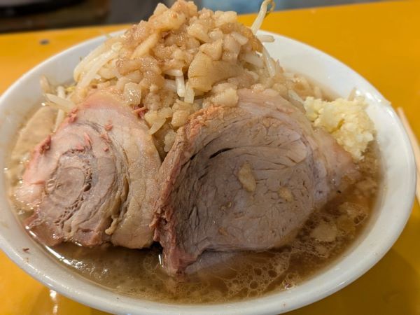 もやしとキャベツがてんこ盛り。野菜は「マシ」だと軽く300g以上入っています。刻んだ背脂のトッピングも、インパクト大です。 角度を変えると、たっぷりのにんにくも♪
