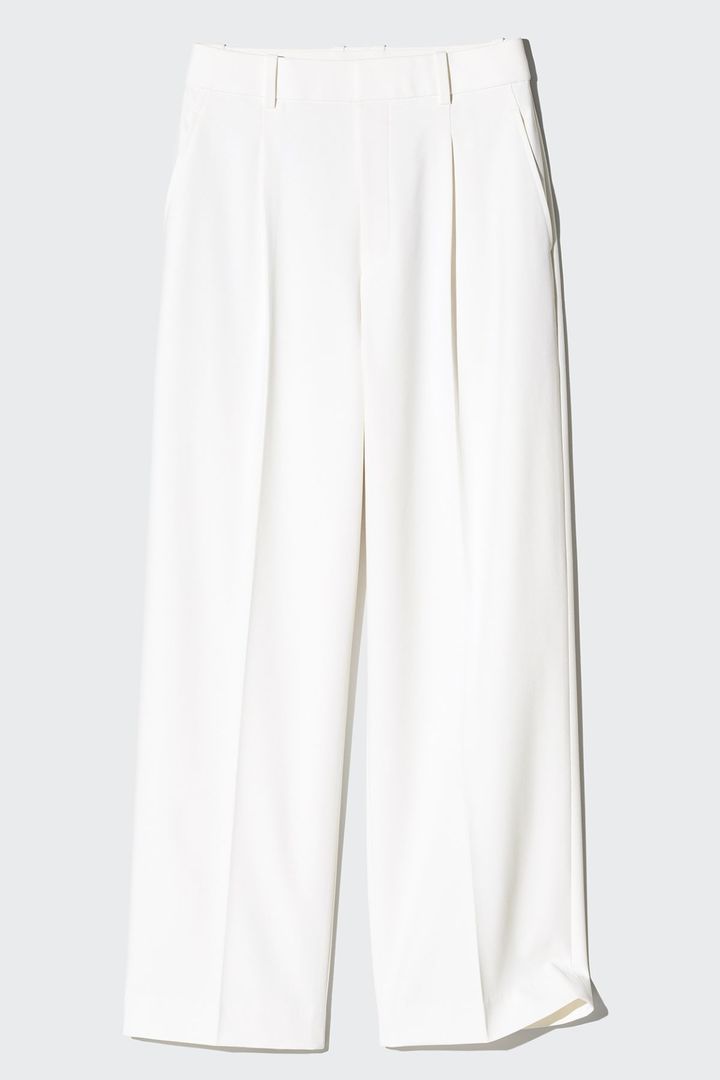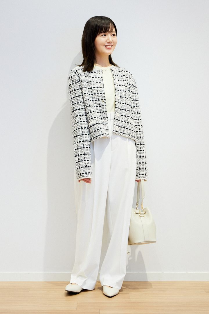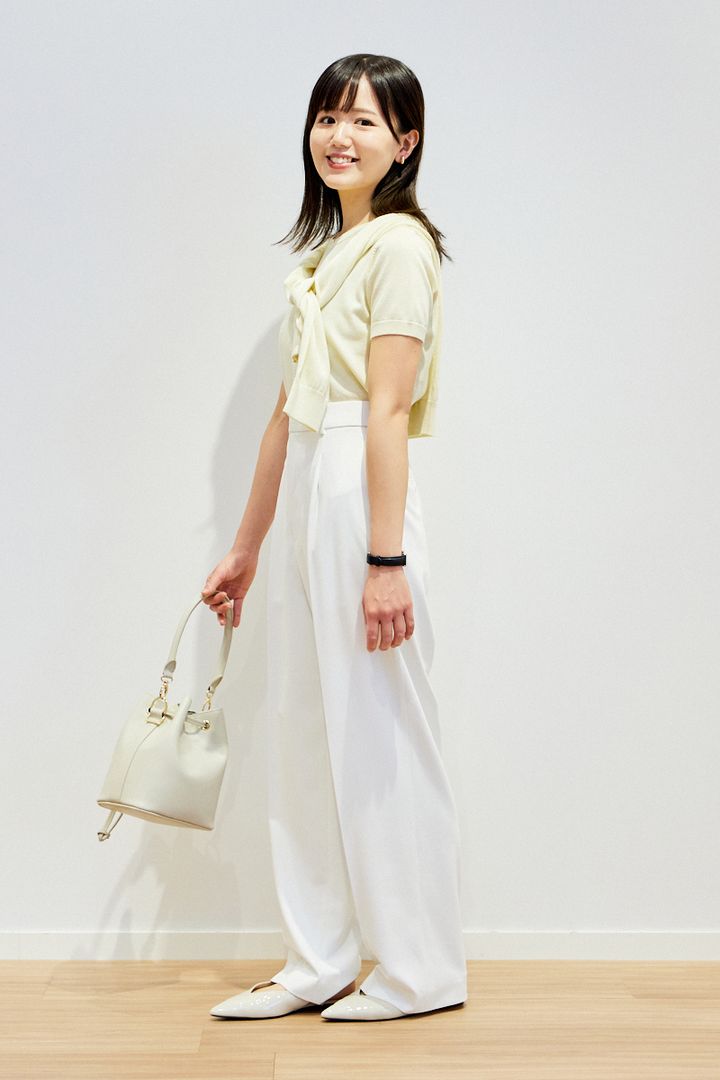 2022年に発売開始されたタックワイドパンツは、あまりの美シルエットぶりに色違いで買う人が続出。濁りない色味で合わせるトップスを選ばないホワイトなら、トレンドのレモンイエローとも相性抜群。オケージョンスタイルでは表情のあるニットジャケットをON。オフスタイルでは半袖ニットと同じ色のカーディガンを肩にかけてこなれカジュアルに。