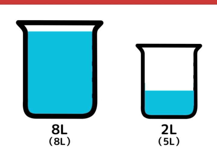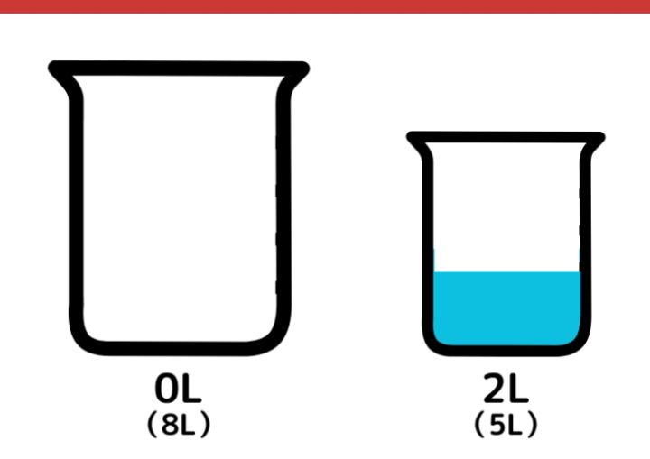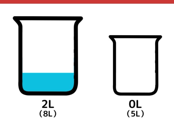 再び5L容器に入っている水を8L容器に移します。8L容器にはすでに5Lの水が入っているので、3Lだけが映り、5L容器には2Lの水が残ります。