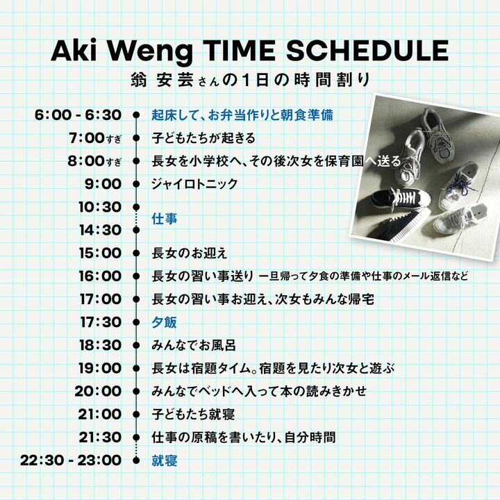 翁安芸さんの時間割りを公開!「睡眠7‐8時間は確保。週4はスニーカーを履いています」