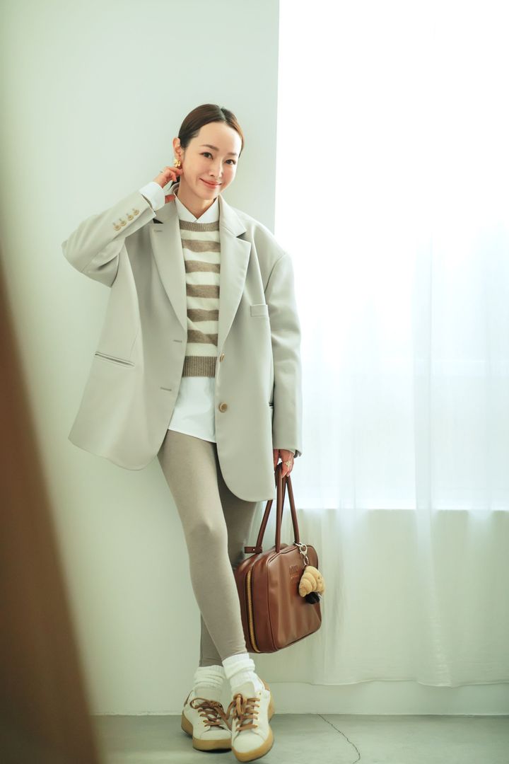 今日合わせたベージュのスニーカーは、通販で見つけた『アディダス』です。子どもの送迎や仕事、友人との予定の前後にワークアウトを入れることも多いので、そんな時はトレーニングウェアに、ビッグジャケットやスクエアバッグ、ジュエリーを合わせたスタイルが定番です」