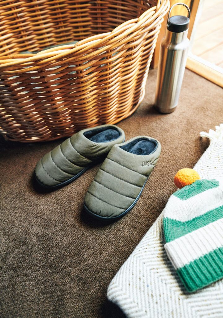 〈スブ〉を代表するサンダル「F-LINE」が、〈アー・ペー・セー〉らしいカーキのカラーリングによってシックな印象に。キルティング加工を施したアッパーは、ダウンを着たかのようなぬくもりが足を包む。4層構造のソールが歩くたびにもっちりとした弾力で、インソールには起毛素材を使っているから素足でも履けるのが嬉しい。外でも室内でも、幅広く活躍する。¥18,700(アー・ペー・セースブ/アー・ペー・セーカスタマーサービス 0120‒500‒990) ニットキャップはp.9で紹介。その他スタイリスト私物