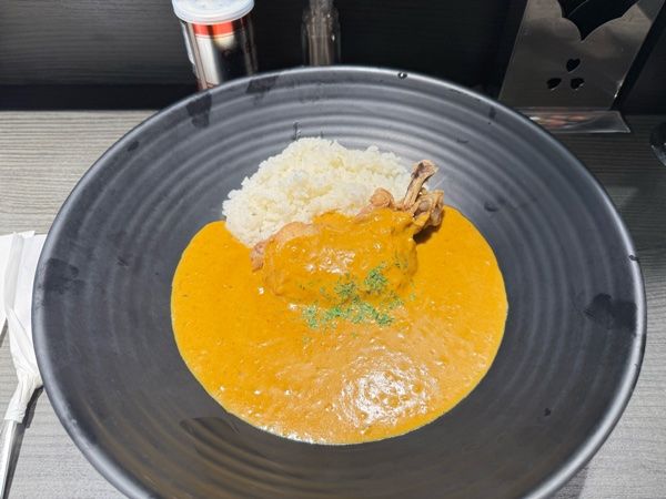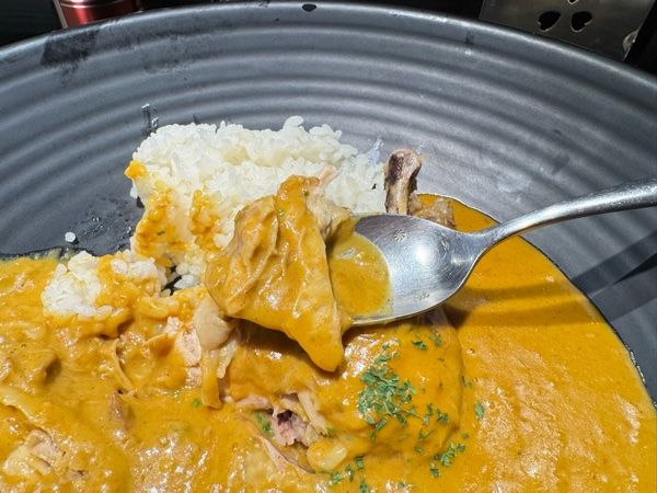 骨付き鶏が、スプーンで簡単にほぐれるほど柔らかく仕上がっています。 驚いたのはこのカレーのソース。 フランス料理はソースが命と言われるだけあり、とにかく味が濃厚。スパイスの心地良い香りと香味野菜の甘み、生クリームとバターを贅沢に使った特別感のあるカレーでした。