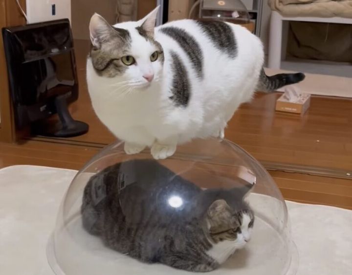 ツルツルのカプセルにどーん! 驚きのバランス力を見せる猫さん