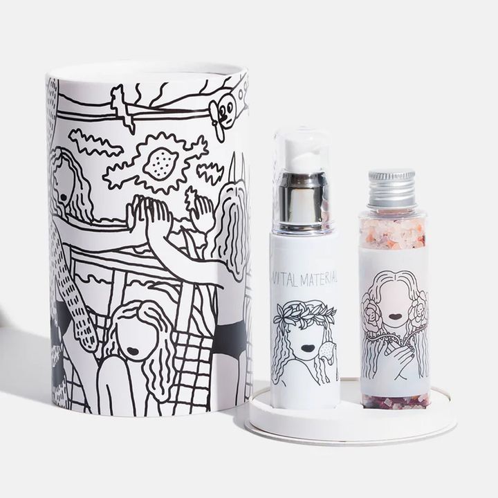 世界からも注目を集めるアーティスト、オートモアイ(AUTO MOAI)による書き下ろし作品をフィーチャーしたヴァイタルマテリアル(VITAL MATERIAL)のギフトボックスは、ホワイトデーのお返しにぴったり。保湿効果もあるオーガニックなハンドジェルとアロマハーブバスソルトのセットで、日頃の疲れや寒さから心身をリフレッシュできる。
