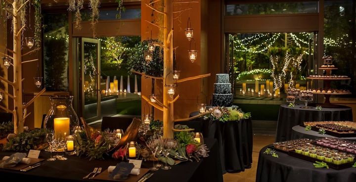 2面が大きな窓になっており、昼間は自然光がたっぷりと差し込む会場「コリアンダー」。けやき坂がライトアップされる期間は夕刻からのパーティもおすすめ。窓外のイルミネーションにリンクさせて、キャンドルやLEDでキラキラの世界を表現!