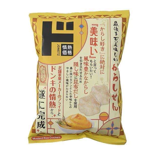 からし好きにぜひおすすめしたい「最後まで美味しいからしせん」。老舗米菓メーカー『ひざつき製菓』とドンキの情熱が詰まった商品です。豊かな風味のからしを引き立たせるため、昆布だしが隠し味に使われています。