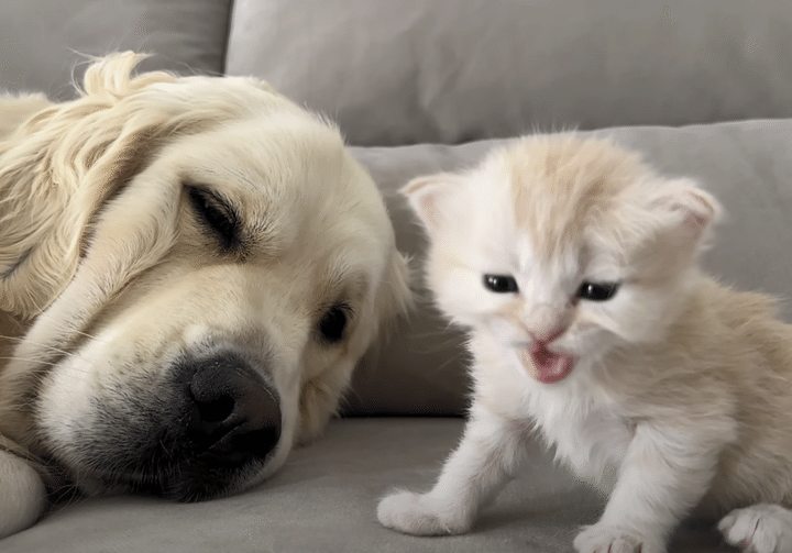2. 声が小さくて届かない?ゴールデンレトリバーさんを起こしたい子猫さん