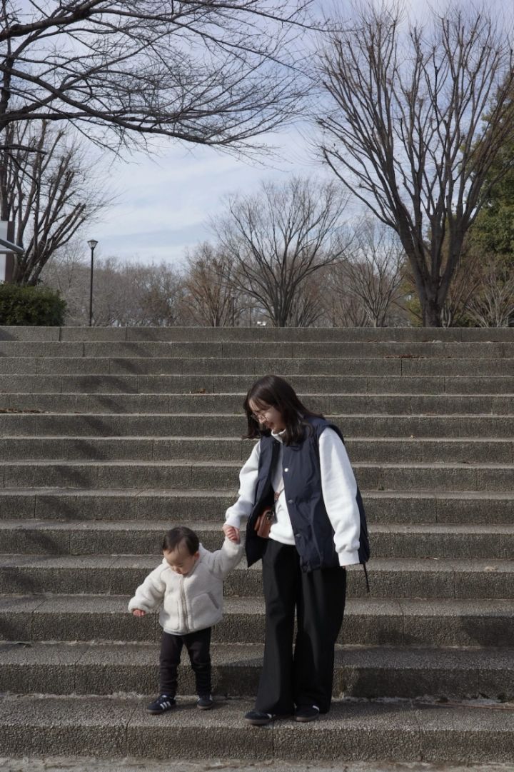親子でユニクロのデニムを合わせてカジュアルに。白と黒、色違いではくといった楽しみ方もできます。