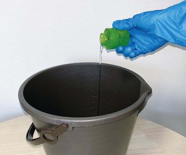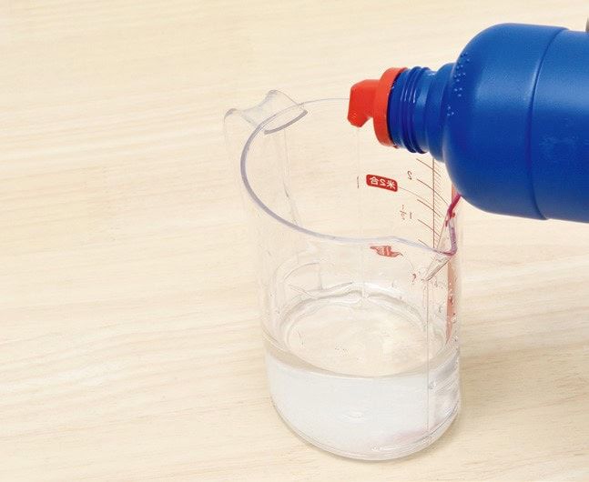 計量カップに水200mL+塩素系漂白剤10mLを入れる。洗剤を塗らない部分には養生をし、汚れてもいい服装で行う。