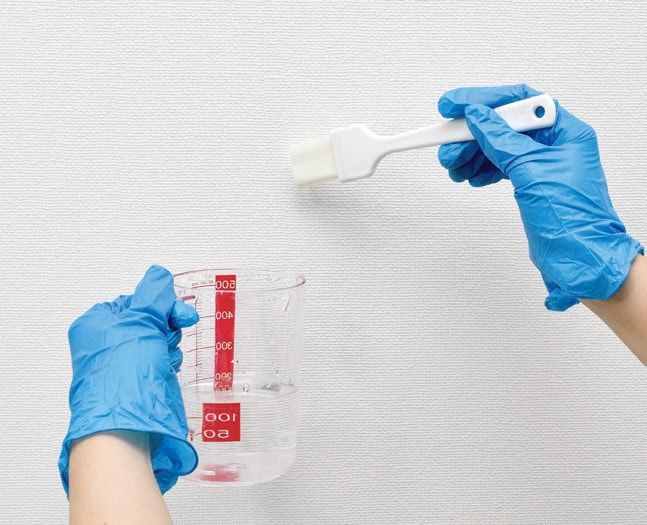 刷毛で黒カビ部分にを塗ってしばらくおく。そのあと、刷毛に水をつけて洗剤を洗い流し、クロスなどで水気を取る。模様や柄のあるところは色抜けの恐れがあるので、目立たないところで試してから行うこと。