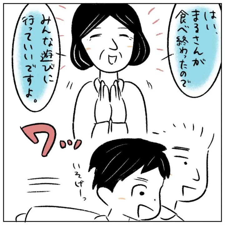 まるさんが食べ終えると、先生が「はい、まるさんが食べ終わったのでみんな遊びに行っていいですよ」と笑顔で言い、クラスメイト達は喜んで教室を飛び出していきました。