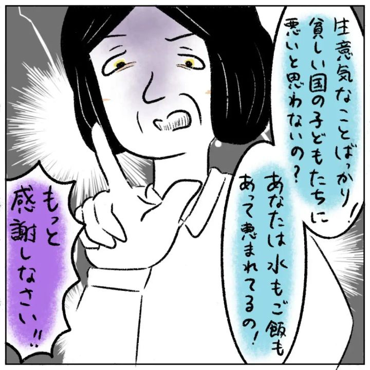 すると先生は「生意気なことばっかり!貧しい国の子どもたちに悪いと思わないの?あなたは水もご飯もあって恵まれてるの!もっと感謝しなさい!!」と言って、水ごはんを拒否したまるさんを責めました。