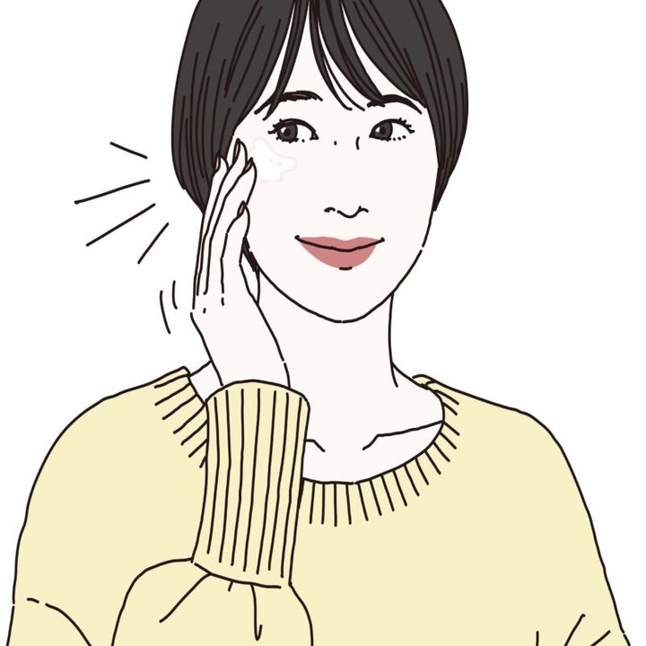 「メーカー推奨量を両手で温めてから、肌を包むようにハンドプレス。皮膚温も上がり一石二鳥です。最初に手を置くところに多くつくので、夜は顔の内側から外側に向かって横づけ。朝はメイクが崩れやすいTゾーンの油分を減らすために外側から」(小林さん)
