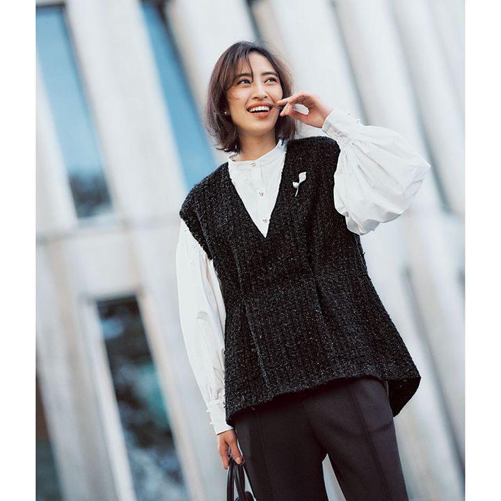 きちんと感のあるツイードジレに 白ブラウスでハレの日モノトーン。 バルーン袖が華やぎをプラス