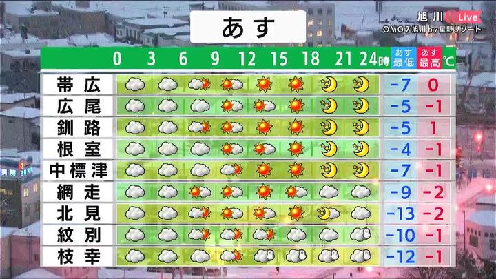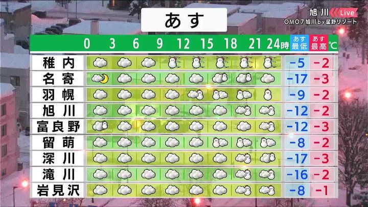 稚内は昼前からふぶくでしょう。留萌は夕方から雪、夜は旭川など内陸でも雪が降ります。朝は名寄や深川で‐17度と冷え込み、日中も寒さが厳しいでしょう。