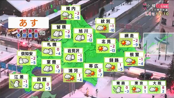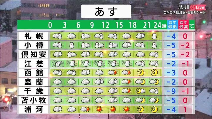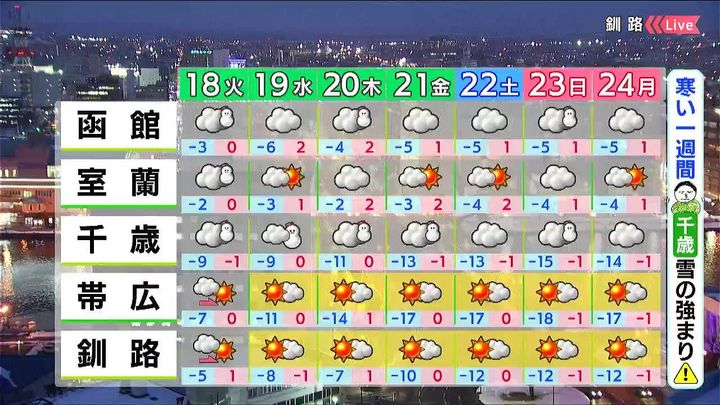 函館や千歳は雲が広がり、千歳でも水曜日は雪が強まるおそれがあります。最高気温は各地とも0度前後で、寒い一週間になりそうです。
