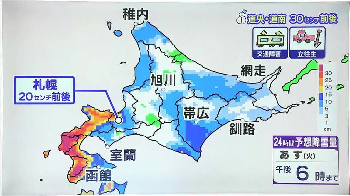 あす18日午後6時までの24時間に、札幌などの道央や道南で黄色やオレンジの範囲では、20センチ前後のまとまった雪になります。