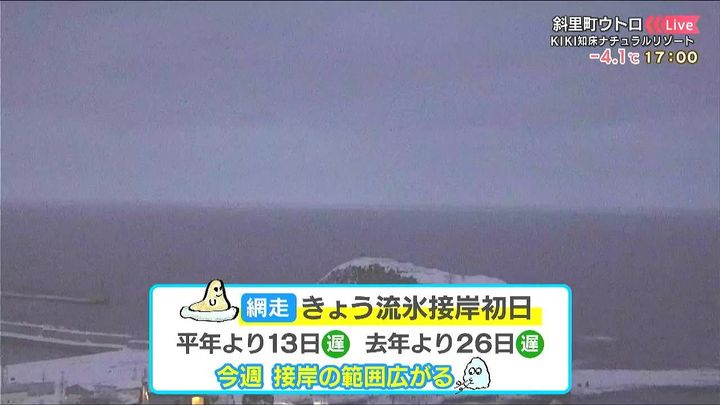 きょう17日、網走で流氷接岸初日となりました。平年より2週間ほど遅い観測でした。