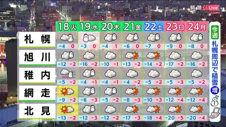 札幌は雪が降りやすく、18日から19日にかけて大雪になるおそれがあります。流氷の影響で内陸やオホーツク海側は寒くなります。