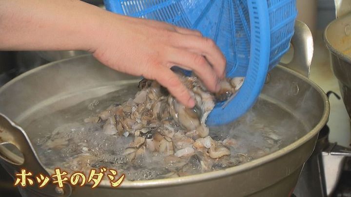 ホッキのひもを大量に鍋に入れ旨味を抽出します。