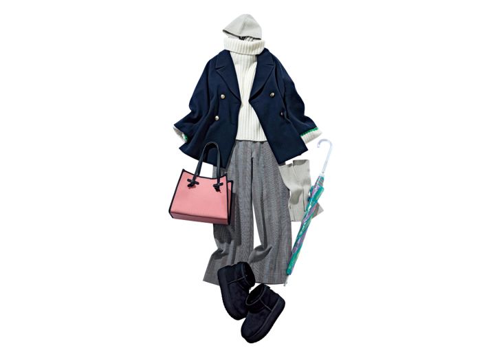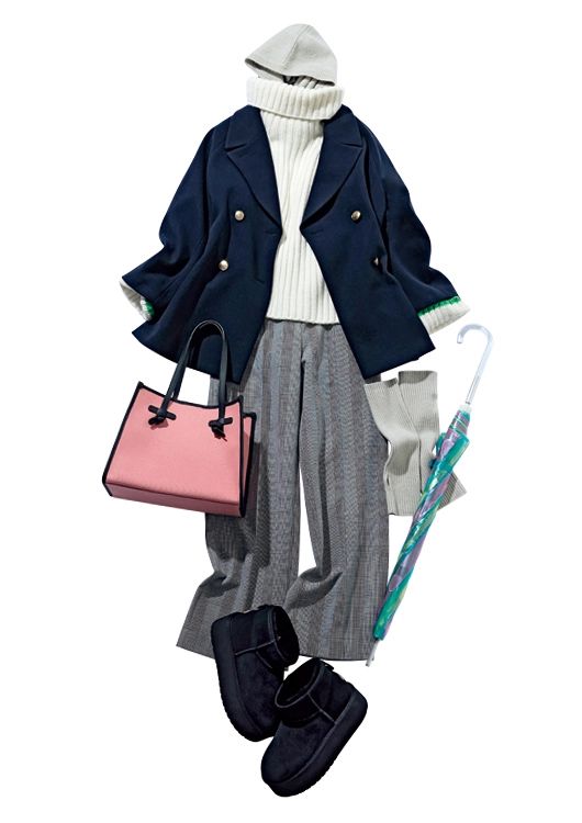 ピーコート¥12,980/グローバルワーク(アダストリア) ラインタートルニット¥33,000/yori チェック柄パンツ¥15,000/PLST ムートンブーツ¥24,200/エミュ(ル タロン 有楽町マルイ店) ショルダーバッグ¥37,400/ジャンニ キアリーニ(ジャンニキアリーニ 銀座店) バラクラバ¥4,990、アームウォーマー¥3,990/ともにアンフィーロ(オンワード樫山) 傘/編集部私物