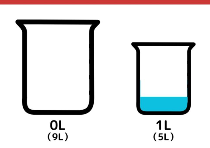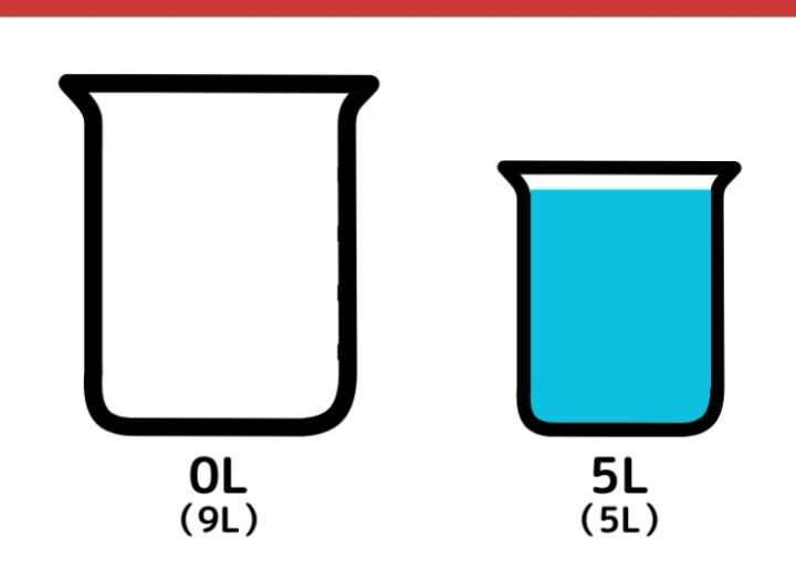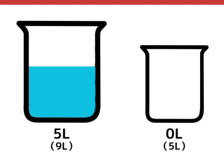 再度5L容器から9L容器に水を移します。9L容器にはすでに5Lの水が入っているので4Lだけ水が移動します。