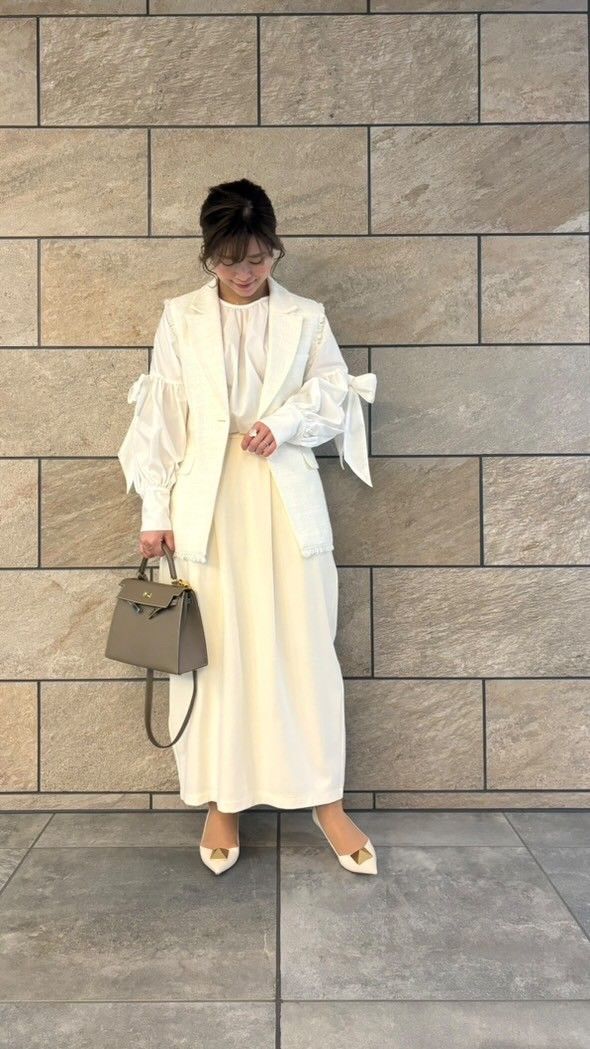 「VERYのセレモニー特集で見つけて一目惚れしたジレを主役に、ハレの日らしくオールホワイトでまとめました。普段から華やかで甘めなコーデが好きなので、ツイードのジレはデイリーにも活用できそうだなと思いこの機会に新調。小学校の入学式は初めてだったのでジャケットなしでの参加はドキドキしましたが、ブラウスのみのママもいたので安心しました」天野結香さん/37歳・160㎝(6歳の女の子と4歳の男の子ママ)