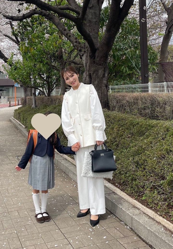 「卒園式はネイビーでまとめたので、入学式は明るいオールホワイトで行こうとジレを新調しました。最初はツイードジャケットにしようと思っていましたが、試着するとかっちりしすぎてしまうかも?と普段にも着回せそうなジレに。公立で人数も多いこともあり、いろいろな服装の方がいたのでジャケットなしでも問題ありませんでした」伊藤杏実さん/37歳・160㎝(6歳の男の子ママ)