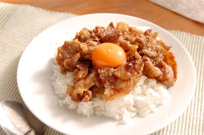 ご飯の上に豚肉をのせ、卵黄をトッピングして、白ゴマを散らします。これでOK。
