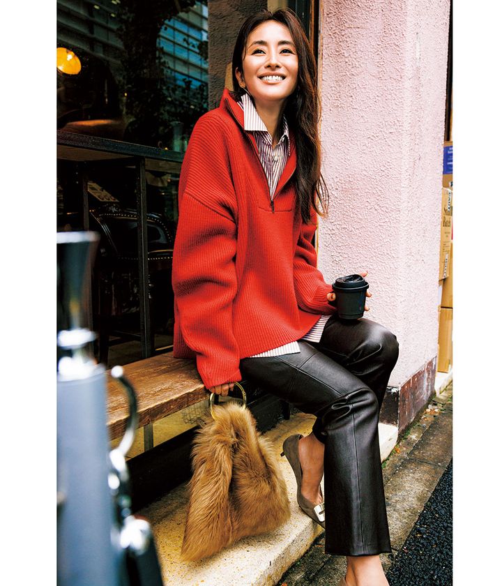 ニット¥22,000(ミースロエ/ミースロエ ルミネ新宿1店)シャツ¥13,200(スピック&スパン/スピック&スパン ルミネ有楽町店)パンツ¥121,000(テラ/ティースクエア プレスルーム)バッグ¥53,900〈カルス〉パンプス¥82,500〈ペリーコ〉(ともにアマン)ピアス¥110,000(ウノアエレ)ネックレス¥96,800(Pearl for Life/ロードス)