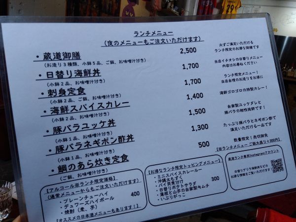 ランチメニューの人気は、日替り海鮮丼だそう。毎日12種類もの魚を仕入れて、刺身をメインにしている創作料理店の海鮮丼、食べてみたいですよね。かおぴぃは、海鮮ゴロゴロの海鮮スパイスカレーが気になりましたよ。魚の骨を砕いて強火で白濁するまで煮た出汁が、決め手になっているそう。絶対オイシイですよね。そして、ウレシイサービス!! チューハイ、ハイボールなどの限定種類のアルコールがランチ限定価格なんですよ。オトクですよね。