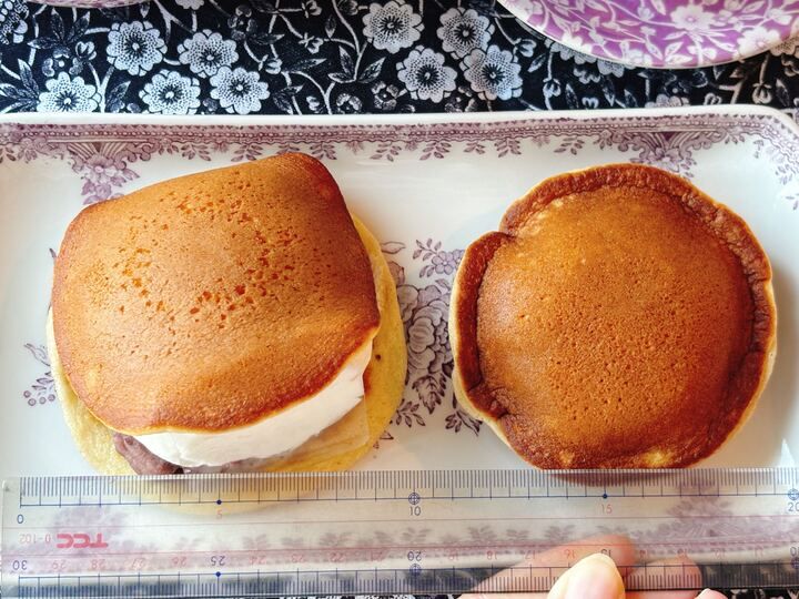 通常のどらもっちは2.8cmほどで3cm無いかなという大きさでしたから、並べてみても厚みの違いがよくわかりますね。