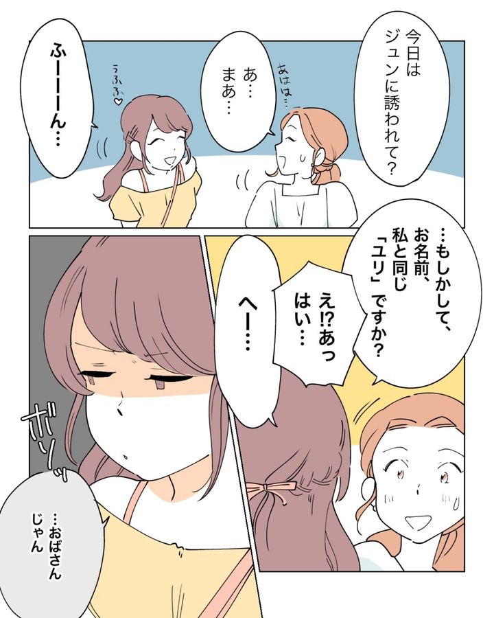 「今日はジュンに誘われて?」と聞かれ、気まずくて「あはは・・・あ・・まぁ・・」と曖昧に返すと、彼女さんはにこやかな笑顔を浮かべて「ふーーーん・・・」と言った後、「・・・もしかして、お名前、私と同じ『ユリ』ですか?」と聞いてきました。「え!?あっはい・・・」と答えると「へー・・・」と独り言のように言った後、ボソッと「・・・おばさんじゃん」と呟いたのが聞こえました。