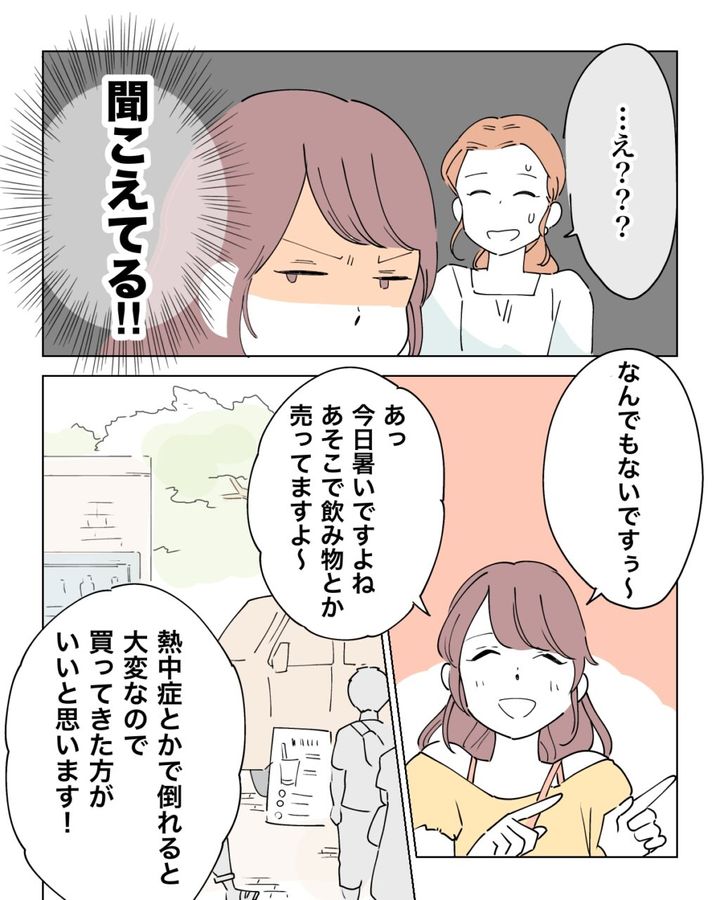 「・・・え???」と聞こえないフリをしたけれど、私・・しっかり聞こえてました!!彼女さんは「なんでもないですぅ~」と笑いながら「あっ今日暑いですよね。あそこで飲み物とか売ってますよ~。熱中症とかで倒れると大変なので買ってきた方がいいと思います!」と話題を逸らしました。
